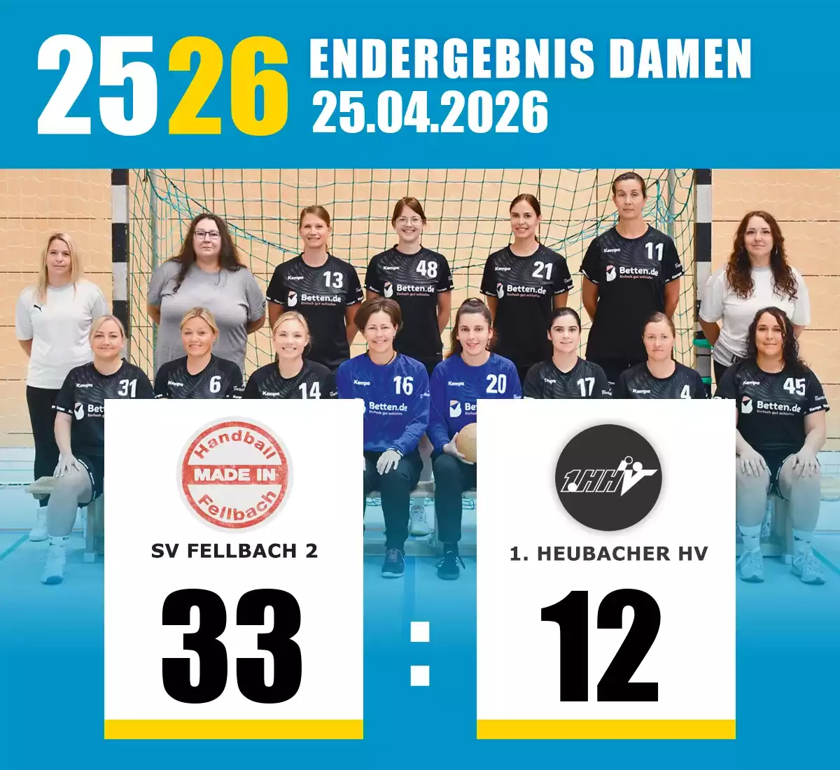 Am kommenden Wochenende geht es für zwei HHV-Aktiventeams ein letztes Mal in der Saison 26-26 auf Reisen. Die Damen treten am Samstag, 25.04. ab 16:00 Uhr in der Zeppelinhalle in Fellbach gegen die zweite Garnitur des SV Fellbach an. Für die Herren 2 geht es im Spitzenspiel Zweiter gegen Dritter um den zweiten Platz in der Bezirksstaffel. Spielbeginn in der Alfred-Kärcher Halle in Winnenden ist am Sonntag, 26.04,. um 17:00 Uhr.